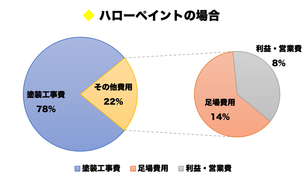 例の通りハローペイントでは約10%以下を営業費・利益としており、元請け会社で例を挙げたA社のような過剰な請求は一切致しません。