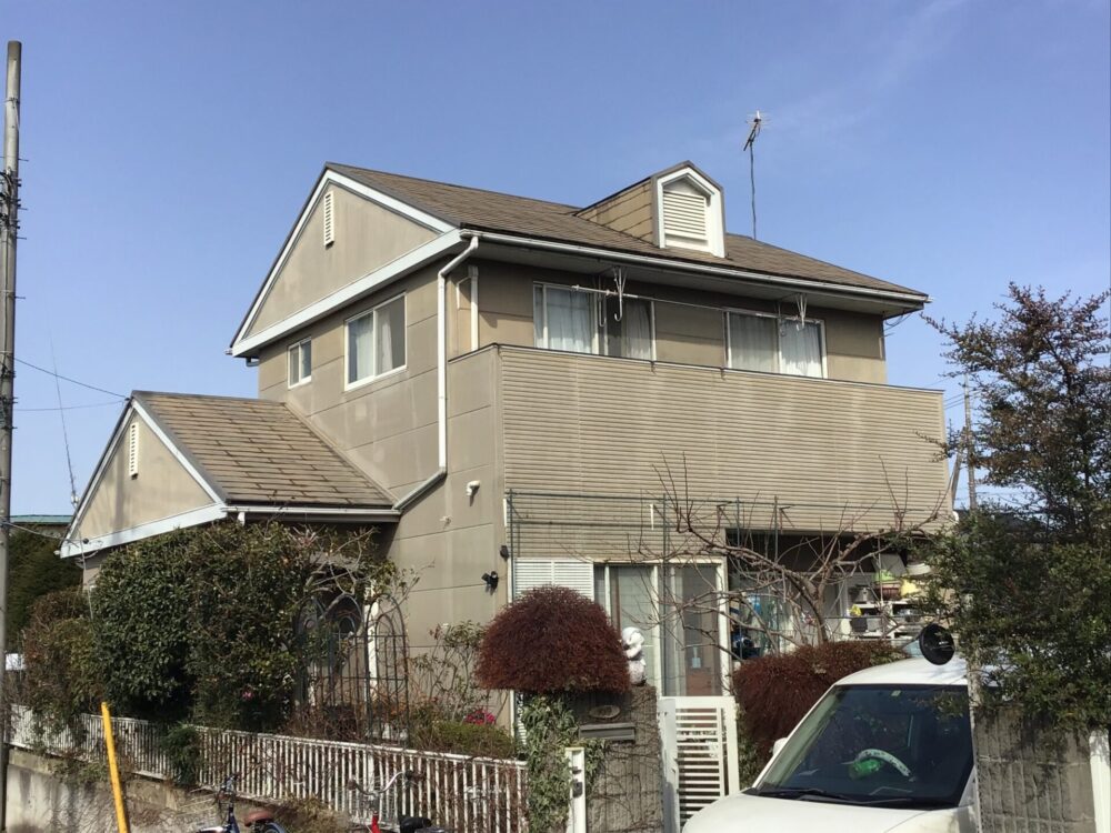 ⇒施工内容紹介使用材料外壁①SK科研クリーンマイルドフッ素色番号15-80D外壁②SK科研クリーンマイルドフッ素色番号19-90D屋根SK科研ヤネフレッシュF色番号RC101付帯部及び玄関関西ペイント1液Mシリコン色 ホワイト基礎塗装基礎ガード色 グレー