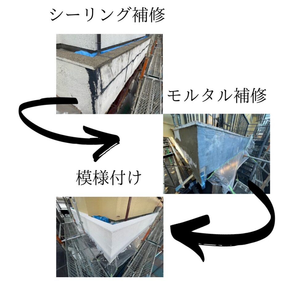 【復元工法】補修後 下塗り(シーラー)→球吹き→ヘッドカット外壁コンクリート部:ひび割れクラック補修【復元再生工法】補修後 下塗り→全面モルタル補修→下塗り(シーラー)→下塗り(防水フィラー)→パターン付け