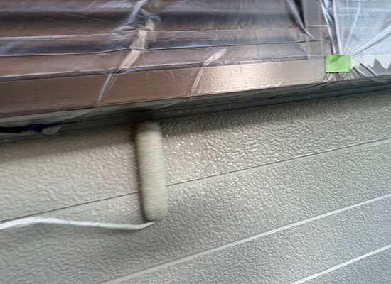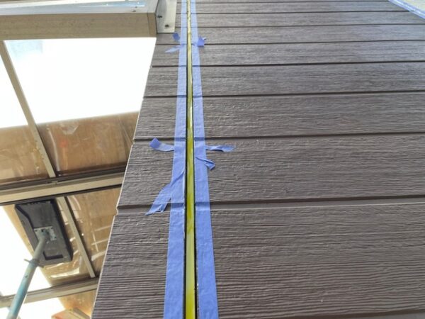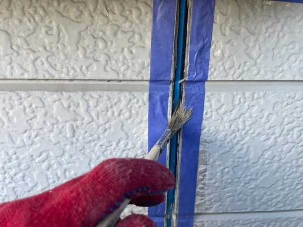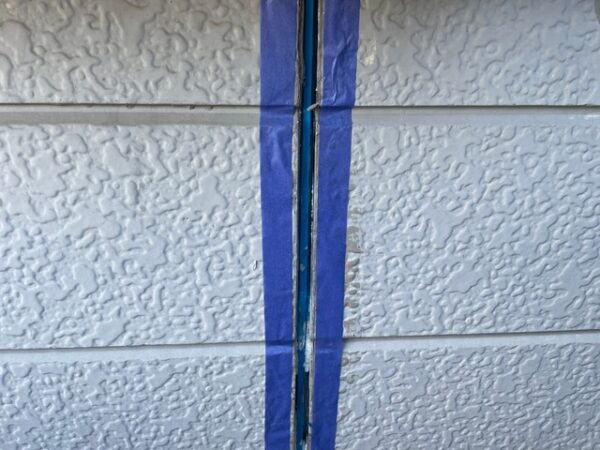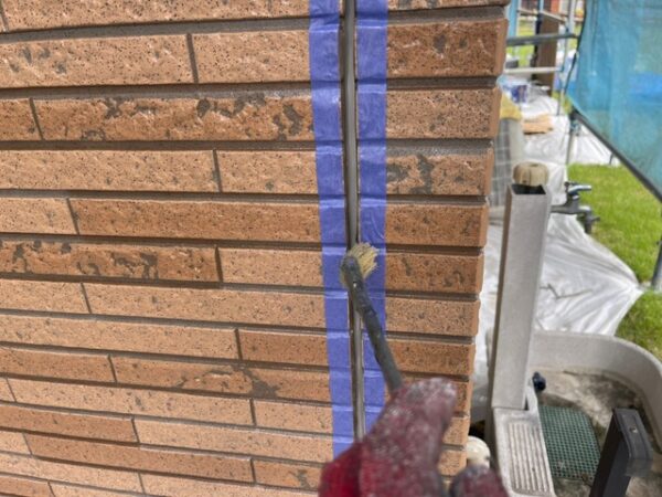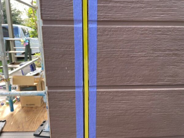 ※撤去の際ボンドブレイカー(3面接着防止シール)が無いことがわかり貼り付けを行いました。これが無い場合3面接着してしまいコーキングが機能せず、サイディング(壁)の割れに繋がりますので要注意です。