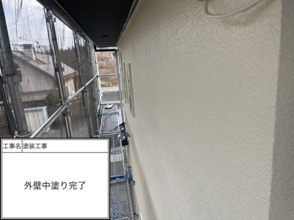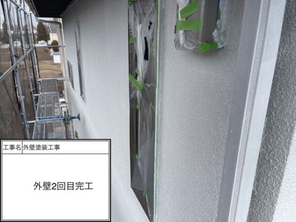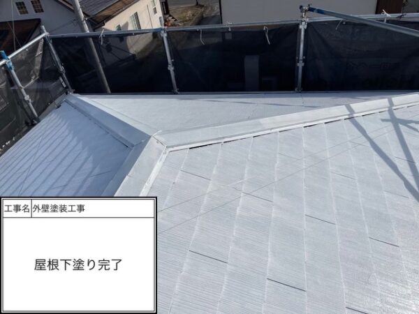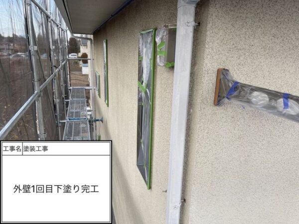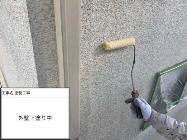 下塗り1回目はシーラー(透明)を入れているので写真では分からないと思いますがしっかりと施工を行っています。吸い込みが激しのでシーラーで塗膜をみっちり付けて次の下塗りに移ります。