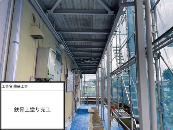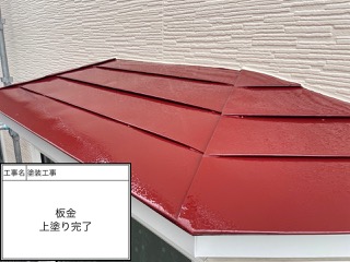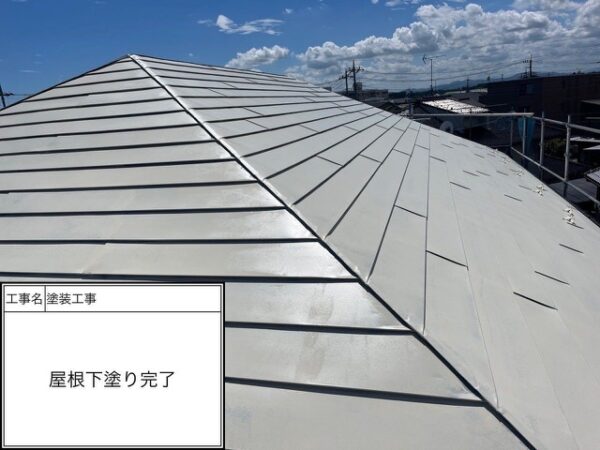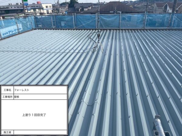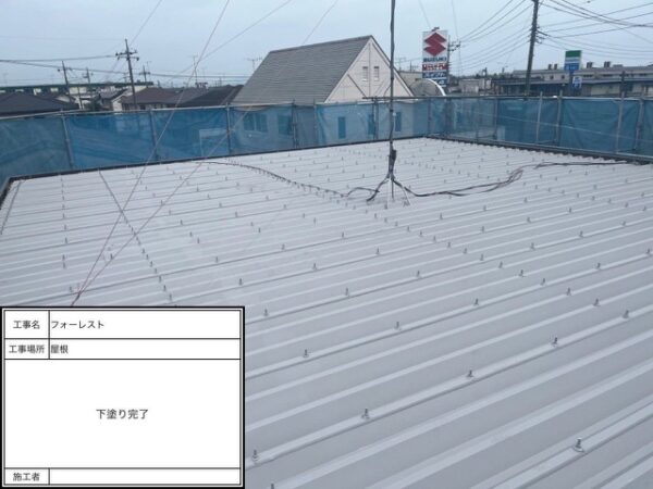 屋根の下塗りに使用したのはサーモテックメタルプライマーを使用しました。この下塗り材はガルバリウム、金属サイディング、ステンレスにも高い密着性を持つ塗料になっております。