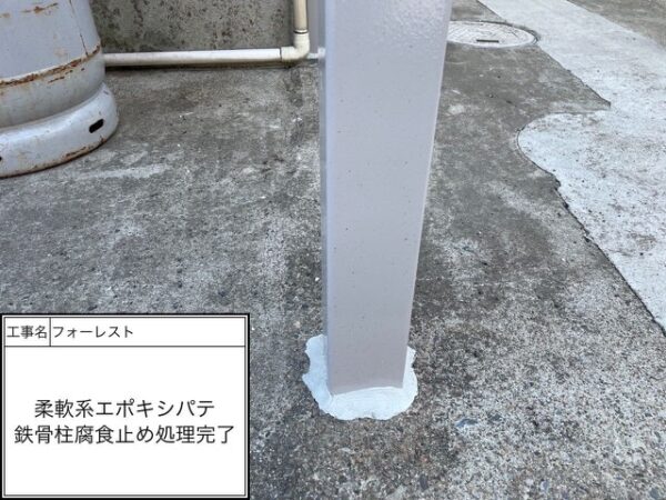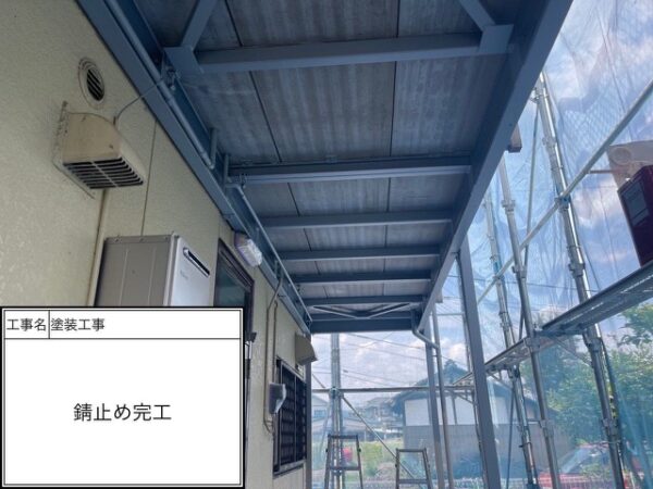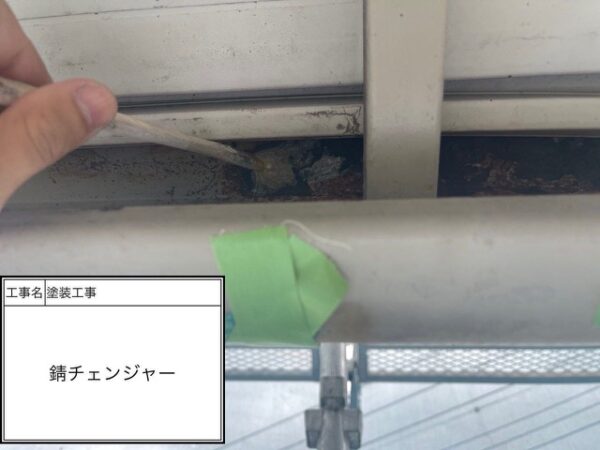 表面の錆をケレンして落としきれなっかった錆の上にこの材料を塗る事で赤錆が黒い錆止めに皮膜に変化し、錆の進行を抑えます。