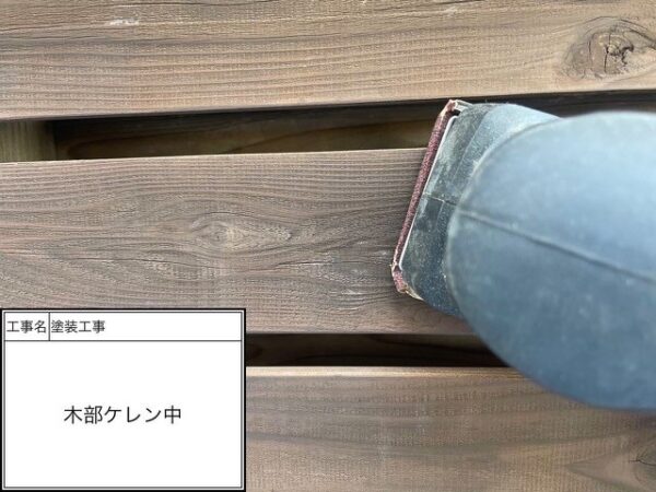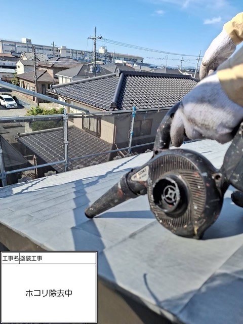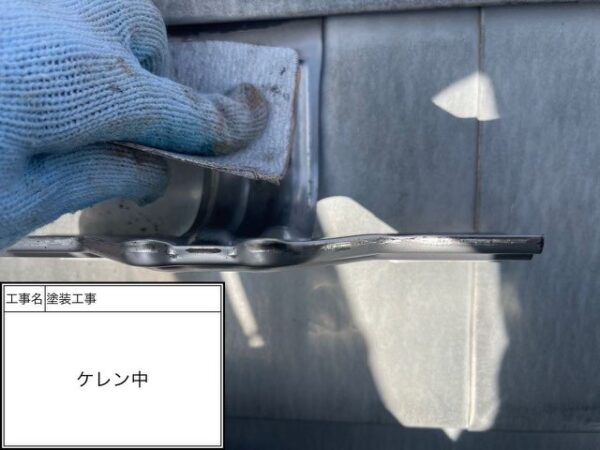 洗浄で汚れを落としましたが塗料の密着性を高めるために屋根全体にケレンを掛けていきます。