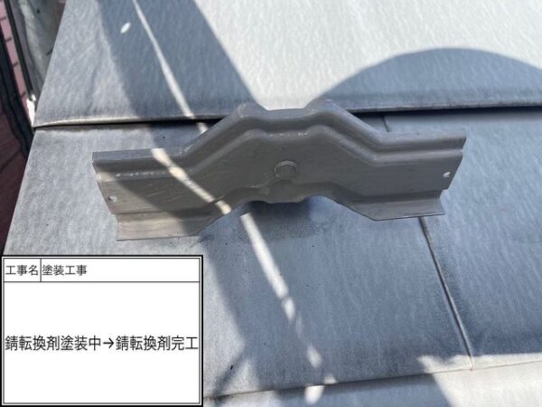屋根の下塗りを塗る前に雪止めにサビ転換材と錆チェンジャーを塗って行きます。