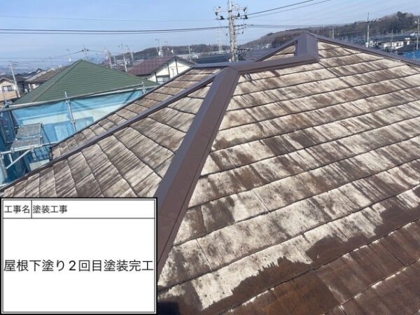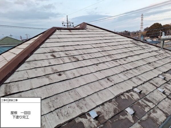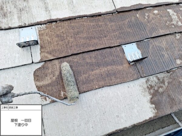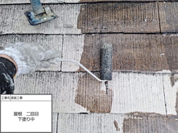 屋根の下塗り1回目を施工しましたが吸い込みが激しいので下塗り2回目の施工に移ります。