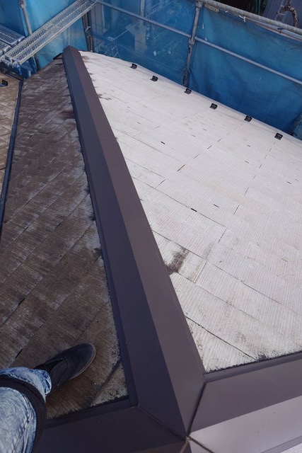 完了棟板金・貫板交換工事※こちらの部分は中の板(貫板)が年数と共に傷んでいき板金を抑える釘などが抜け落ちグラグラ浮いてしまいそこから雨水の侵入や、強風により飛ばされる可能性が見込まれる箇所であり必要であれば行うべき工事となります。