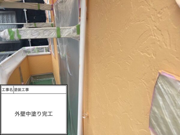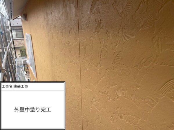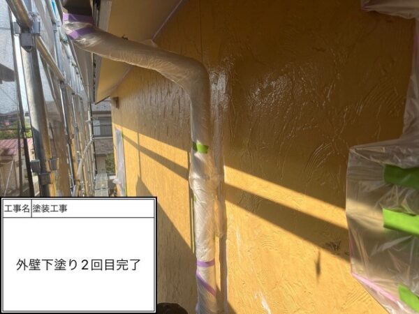 下塗り1回目はシーラー(透明)を入れているので写真では分からないと思いますがしっかりと施工を行っています。吸い込みが激しのでシーラーで塗膜をみっちり付けて次の下塗りに移ります。