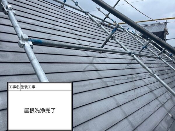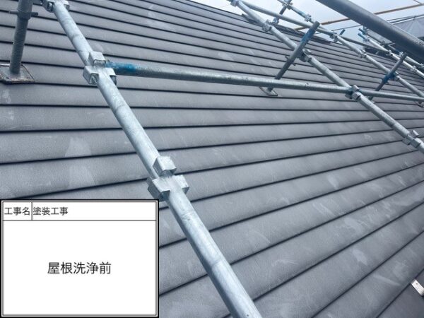 施工内容屋根塗装高耐久遮熱フッ素塗装工事外壁塗装高耐久無機塗装工事【屋根塗装・施工の流れ】屋根塗装工事グレード:遮熱フッ素塗装使用塗料:水谷ペイント塗料品名:快適サーモF 色:サーモN6グレー