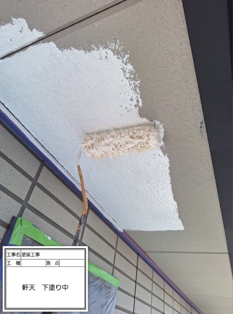 軒天もサイディングと同じ素材なので外壁と同じ下塗り材を入れて行きます。