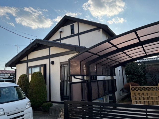 本来の軒天は白色で汚れも目立ちやすいので色が濃く高級感が出る色で塗装を行いました。