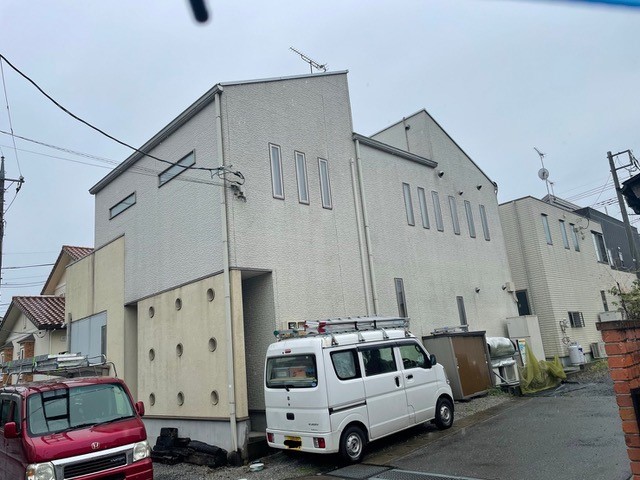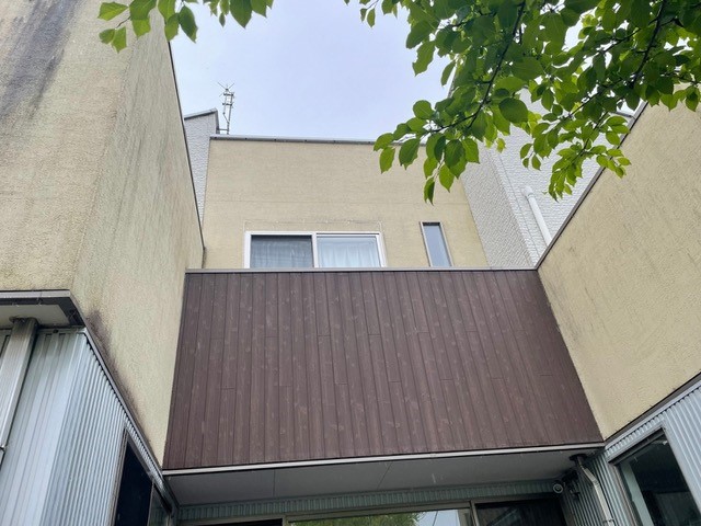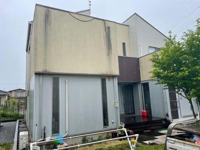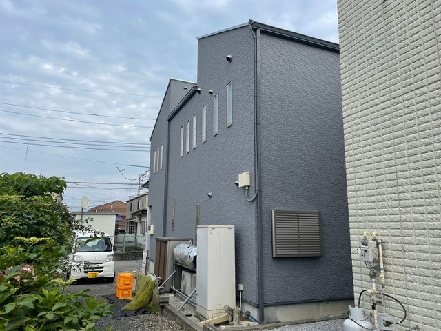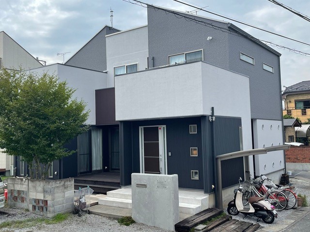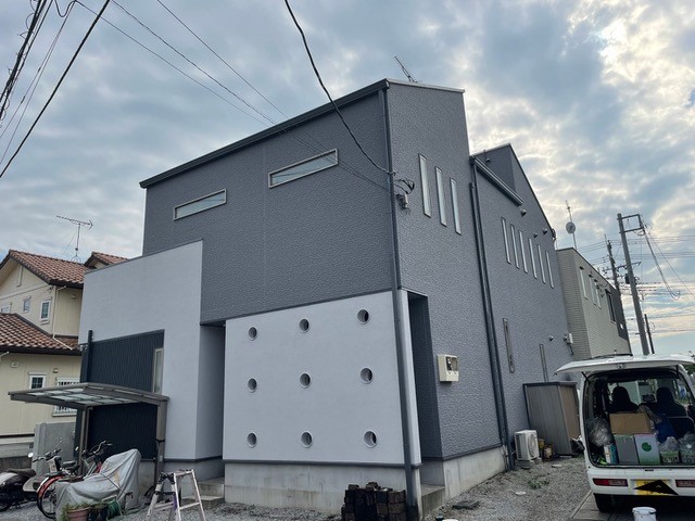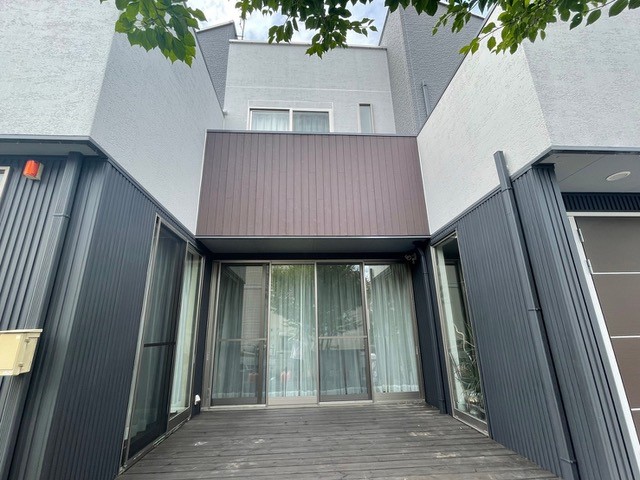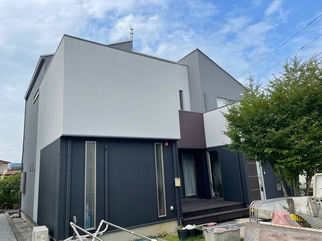 最近の色使いの家にしたい コーキングが心配 との声から始まりました。3種類の外壁を用いられたご自宅です。 1.サイディング 2.塗り壁 3.ガラバリウム 上記3種類が用いられてます。 塗り壁に関しては下地がモルタル系などではなくサイディングという事もありその点も考慮しての塗装を行いました。