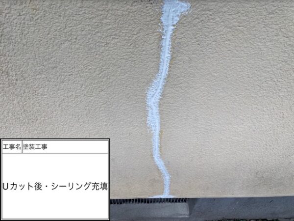Vカットが終わって埃を除去した後にコーキングが密着するようにプライマーを塗って行きます。