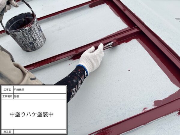 ローラーで入らない所はこのようなハケでの施工をして隙間にもしっかりと塗装をします。
