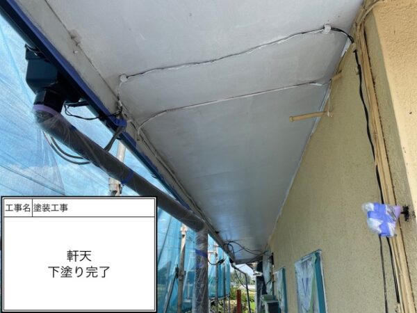 軒天に下塗りが充分に密着したからこのような美しい仕上がりが可能になります。