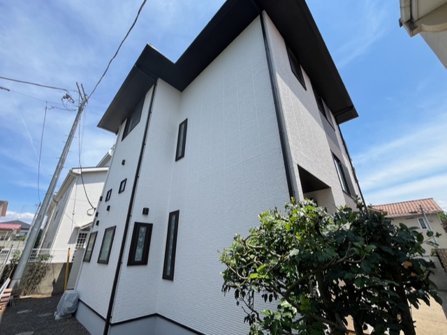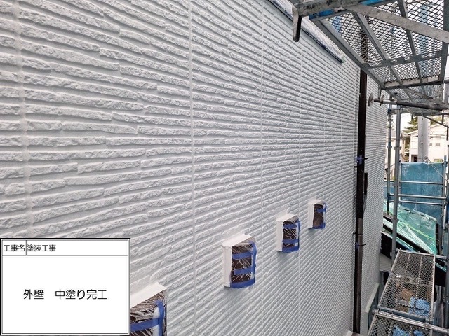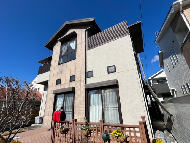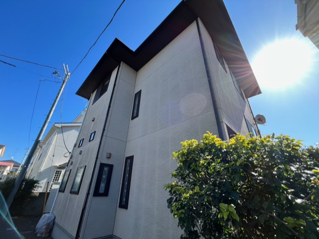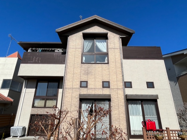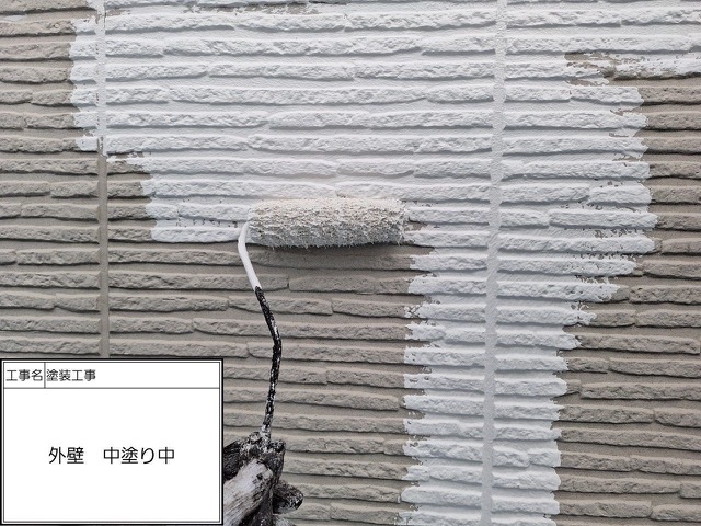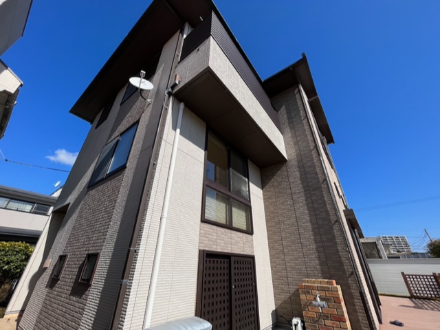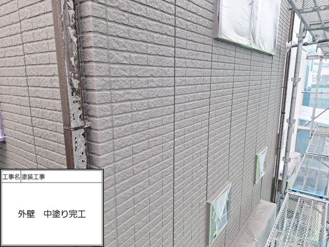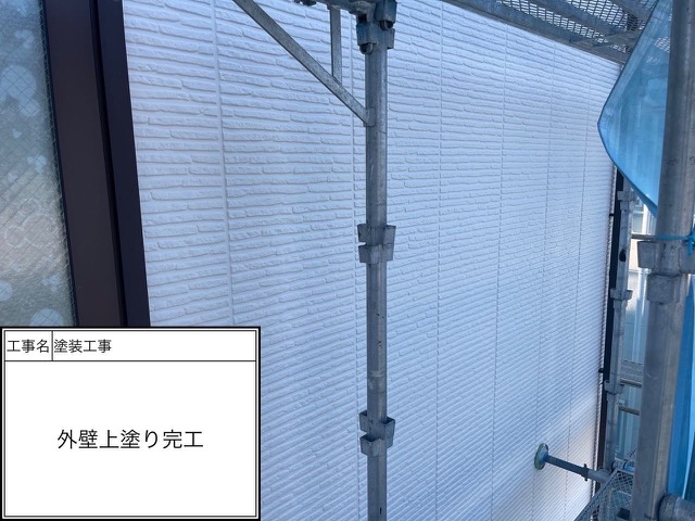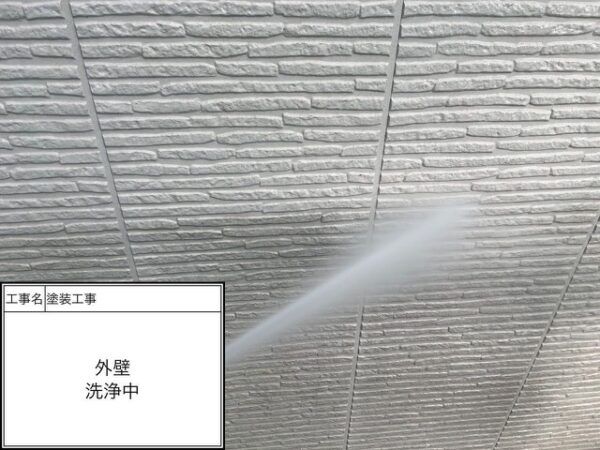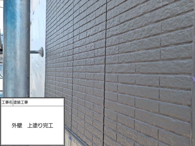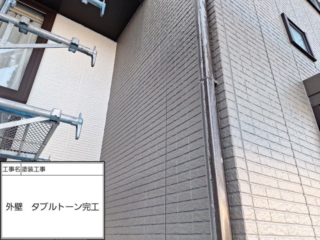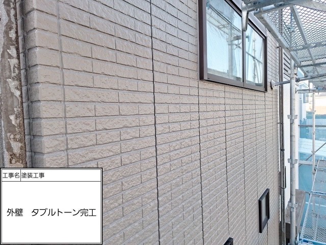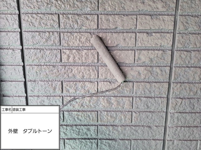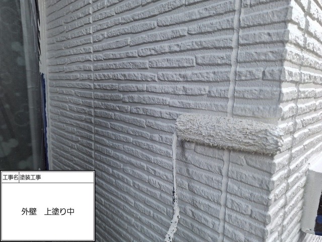 使用塗料:関西ペイント塗料品名:ダイナアクセル 色:メイン22-90A ダブルトーン目地19-50A 上塗り19-50B【工事の流れ】