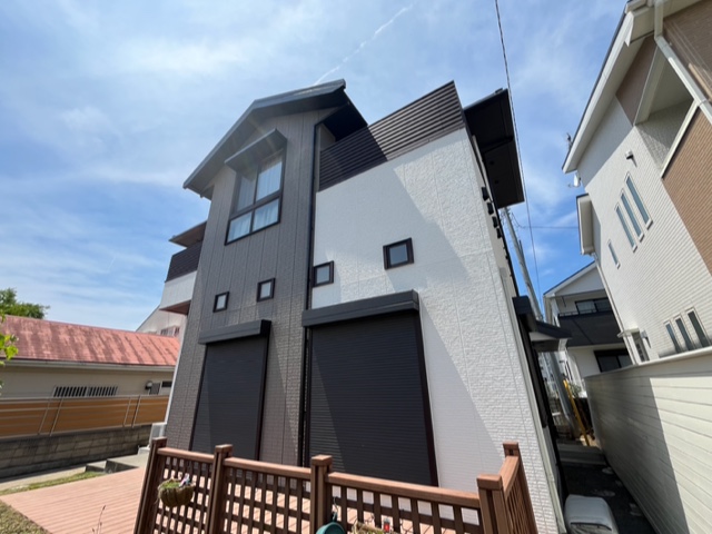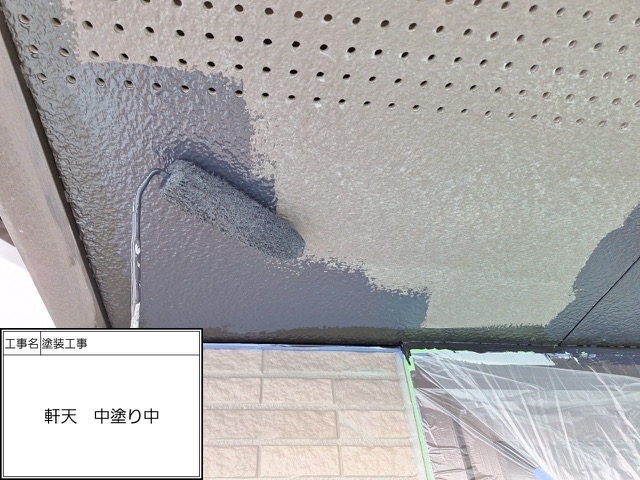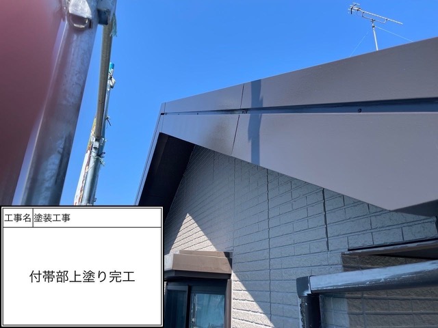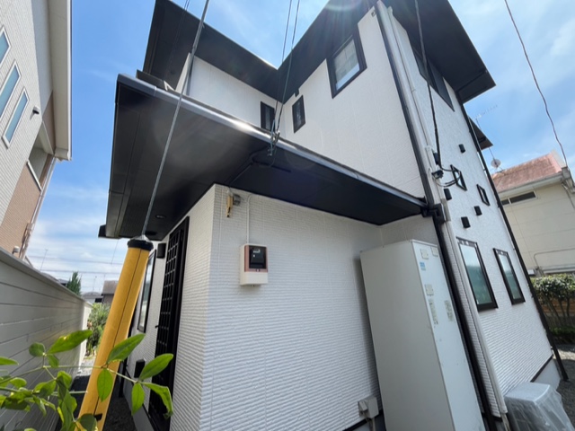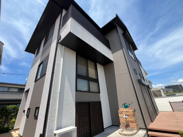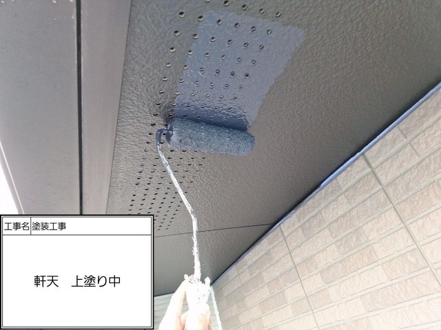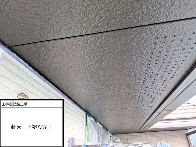 軒天アクセントカラー塗装※軒天が白というのは単なる固定概念で最近の建築物は割と暗めが流行りで、塗り替え塗装工事で暗めの色を入れれば今風のお家に生まれ変わります。白じゃ実現出来ない雰囲気がお好みの方はお問い合わせお待ちしております。