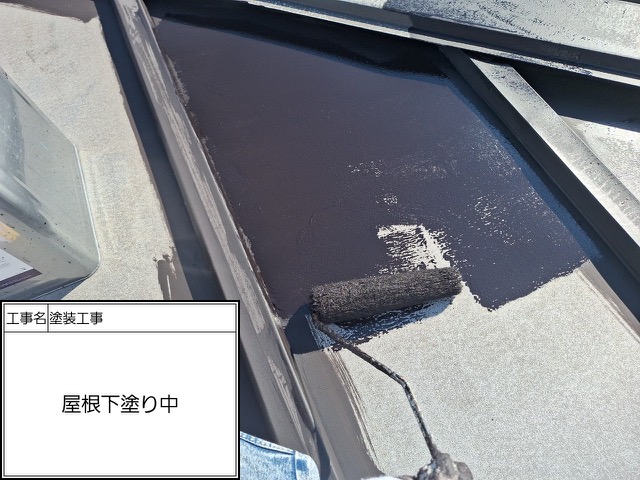 屋根下塗りローラー塗装中