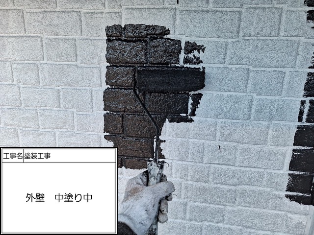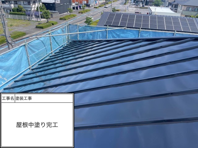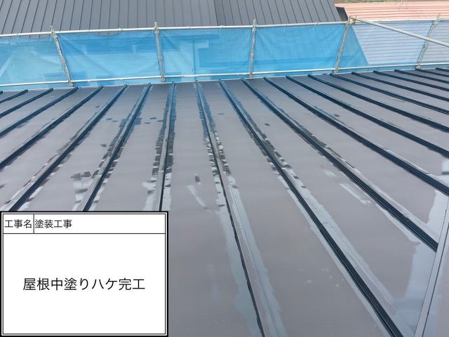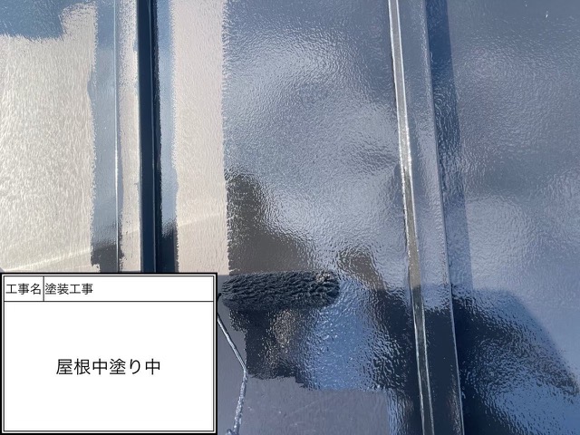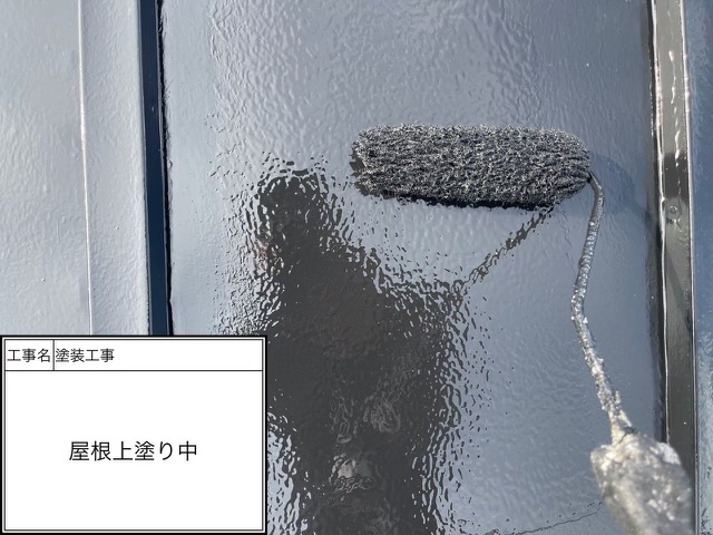 屋根中塗りローラー塗装中