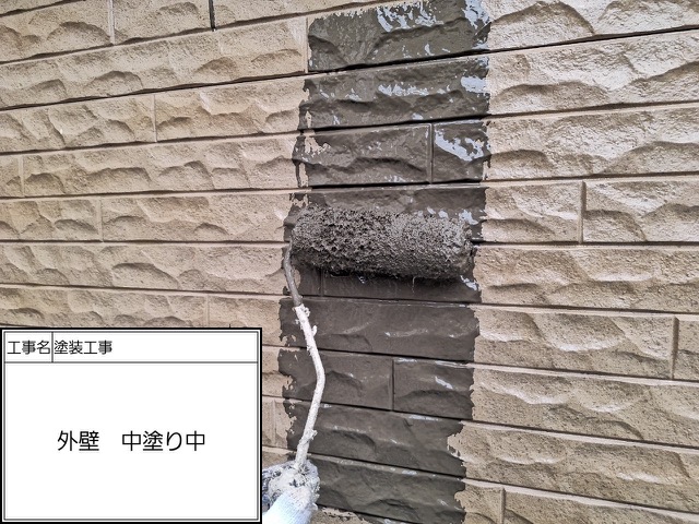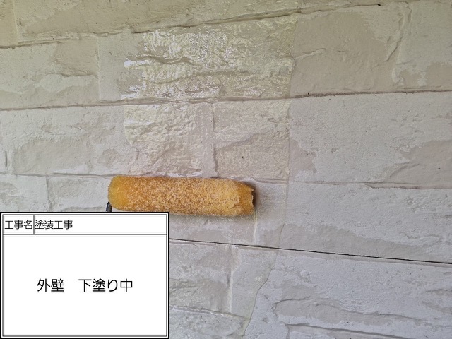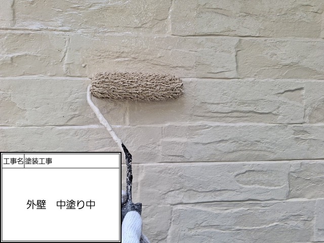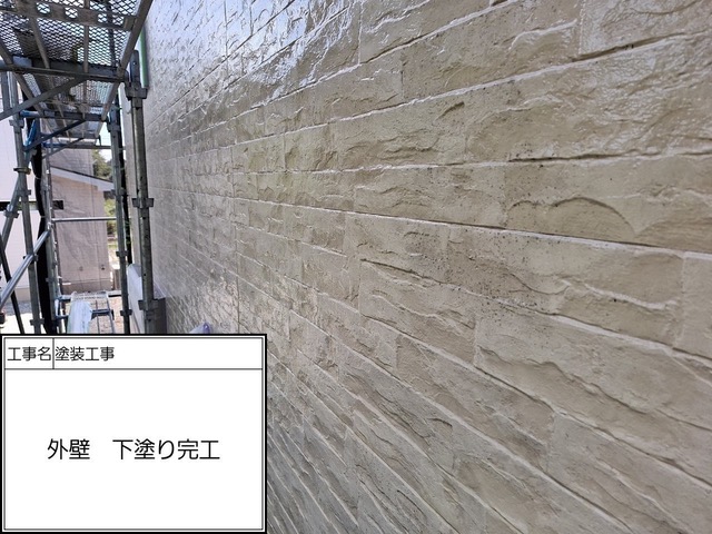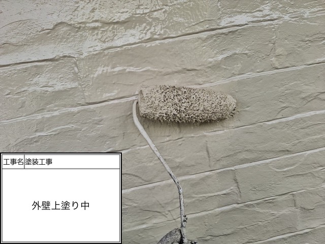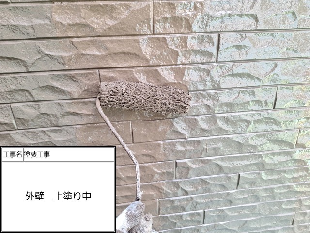 下塗りに使用したのは無機有機ハイブリッドEPOです。あらゆる旧塗膜に密着して最大限の密着性を持つ材料になります。中塗り